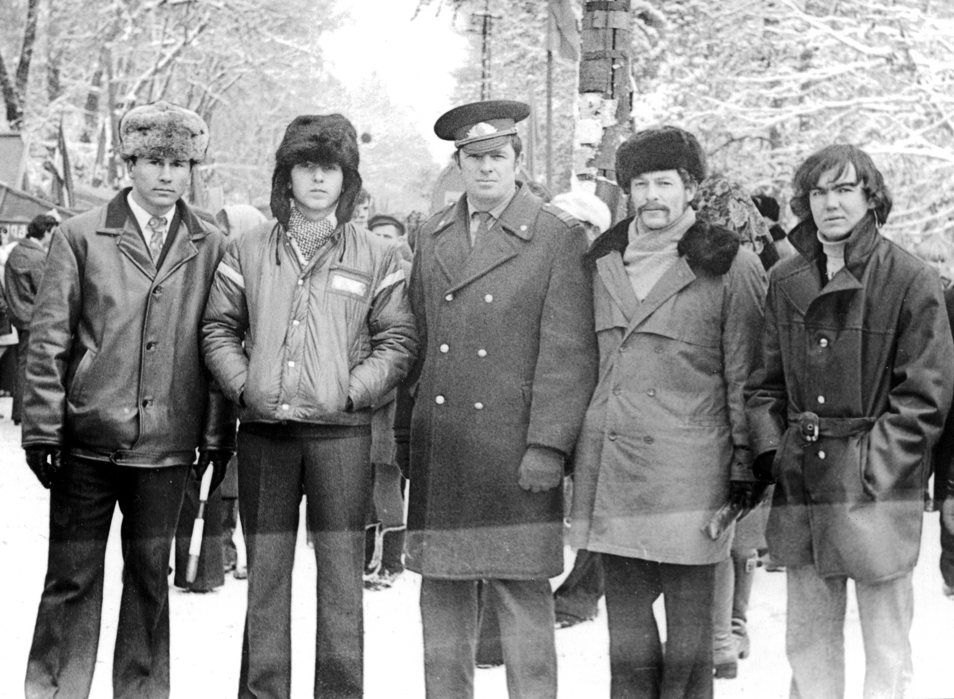 На снимке слева направо: Виктор Очеретин, Сергей Рогачев, участковый инспектор Иван Федорченко, я, Валерий Беспалов.